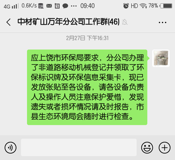 萬年分公司現有28臺套設備需要登記取證,經過管理人員不懈努力,采集工作順利完成,經市、縣環保部門的審核,分公司于20202月在萬年縣生態環境局領取非道路移動機械環保信息標示牌及環保信息采集卡。