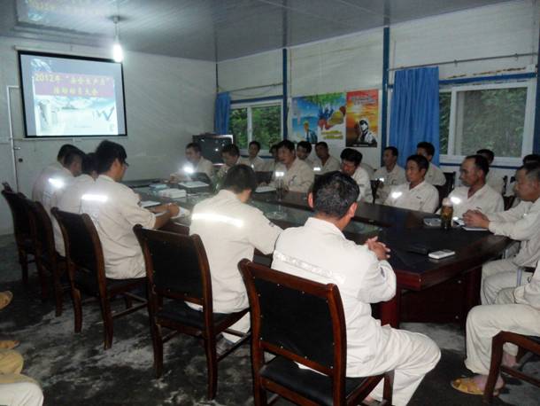 2012年安全生產月到來之際。江油分公司國大項目部實時舉行了以“科學發展、安全發展”為主題的 “安全生產月”活動動員大會江油分公司國大項目部及大三元分隊全體員工參加會議。