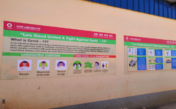 按上級黨委、地方黨工委和公司黨委要求,贊比亞自疫情爆發以來,項目按疫情防控要求,印制張貼防疫知識及輿情防控宣傳畫報多張,宣貫疫情期間的社交距離、會議組織、防護用品的正確佩戴、如何洗手等方面的內容,覆蓋項目生活區和施工現場等區域。同時利用室外班前會的時機對中贊員工開展疫情輿情防控應知應會,應執行的教育培訓和演練。